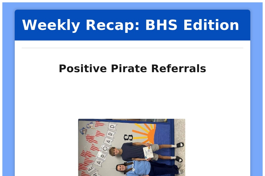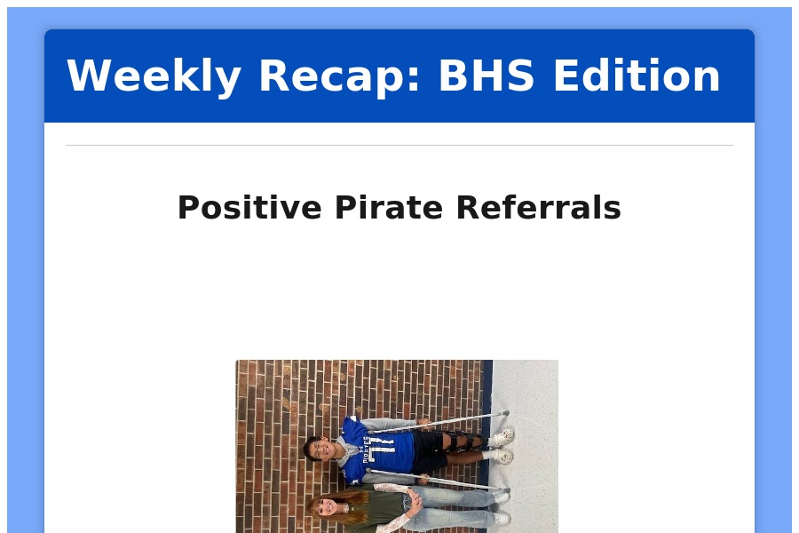 Weekly Recap: BHS Edition Positive Pirate Referrals Gabe Gander Gabe Gander was selected by Mrs. Derendinger for a positive office referr. . .