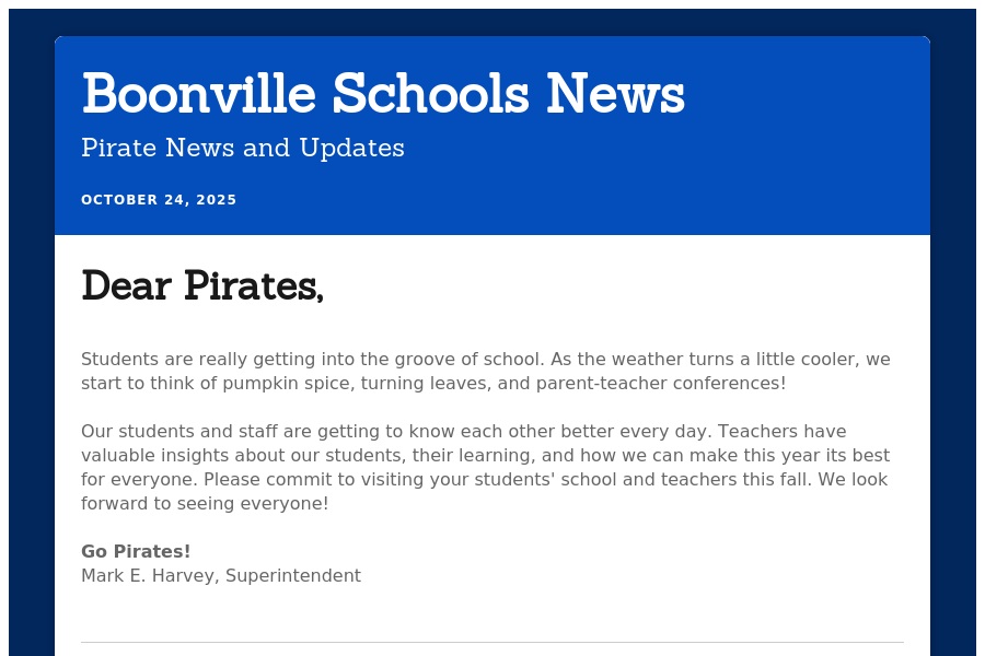 Boonville Schools News Pirate News and Updates October 24, 2025 Dear Pirates, Students are really getting into the groove of school. As the weather turns a little . . .